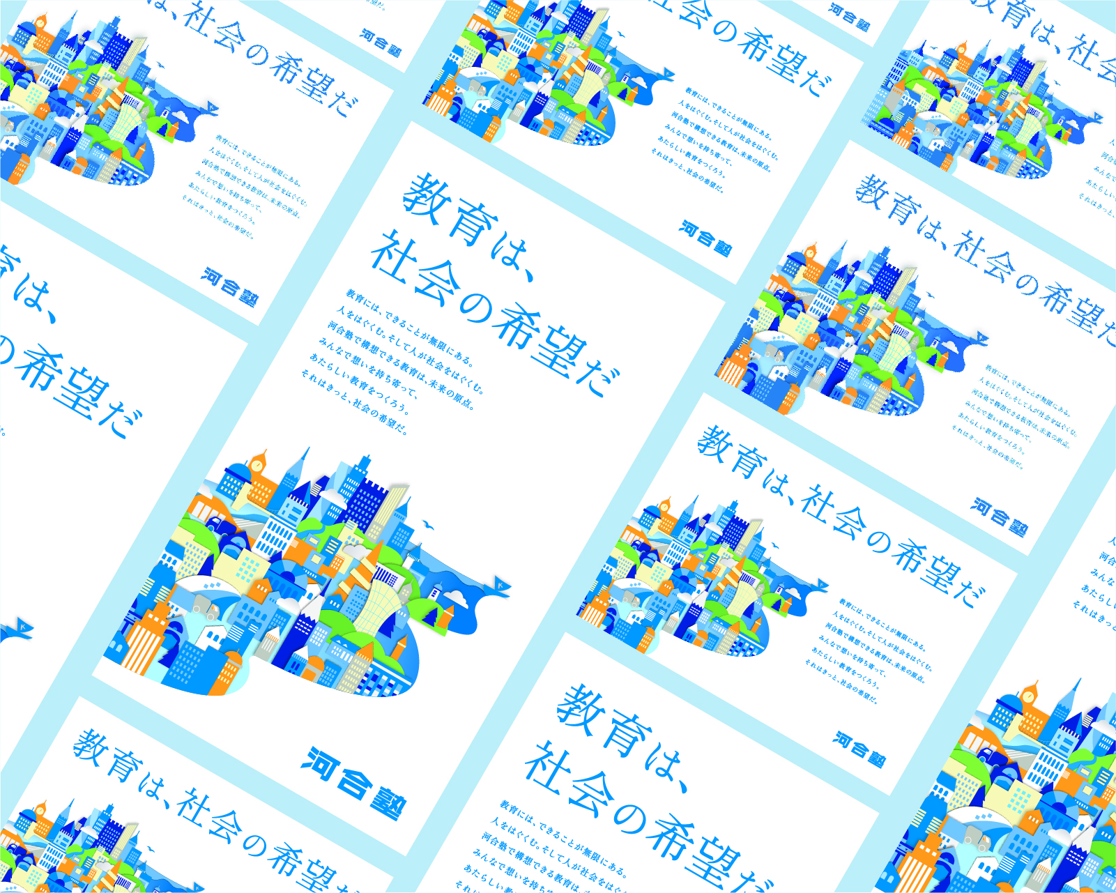 「教育は、社会の希望だ」というメッセージを伝えるため、本ビジュアルは河合塾がという船が、教育で未来を切り開く様子を切り絵をイメージして表現しました。未来の都市や自然、さまざまなモチーフを一つの風景として描くことで、教育が個人の可能性を広げ、その先の社会へとつながっていく広がりを感じられる構成としました。河合塾ブルーを基調に、オレンジやグリーンをアクセントとして加えることで、知性や信頼感の中に、明るく前向きな未来への期待を込めています。切り絵ならではのやわらかな立体感により、親しみやすく、希望を感じられるビジュアルを目指しました。