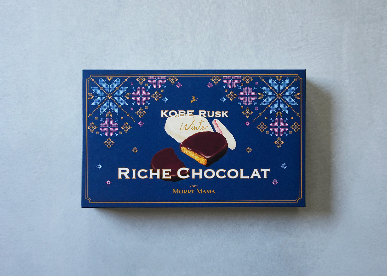 冬限定商品「リッチショコラ」の箱および個包装ピローのリニューアルを担当しました。チョコレートをまとったラスクの特長を引き立てるため、2種のフレーバーそれぞれの個性が伝わる構成としています。デザインでは「冬の温かさ」をテーマに、ノルディック柄をモチーフとして採用。編み物を思わせるやさしい表情や、神戸の冬景色に着想を得た光のリズムを重ね、手に取った瞬間から季節感が伝わる表現を目指しました。完成したパッケージは売場における視認性を高め、購買行動を後押しする結果につながっています。