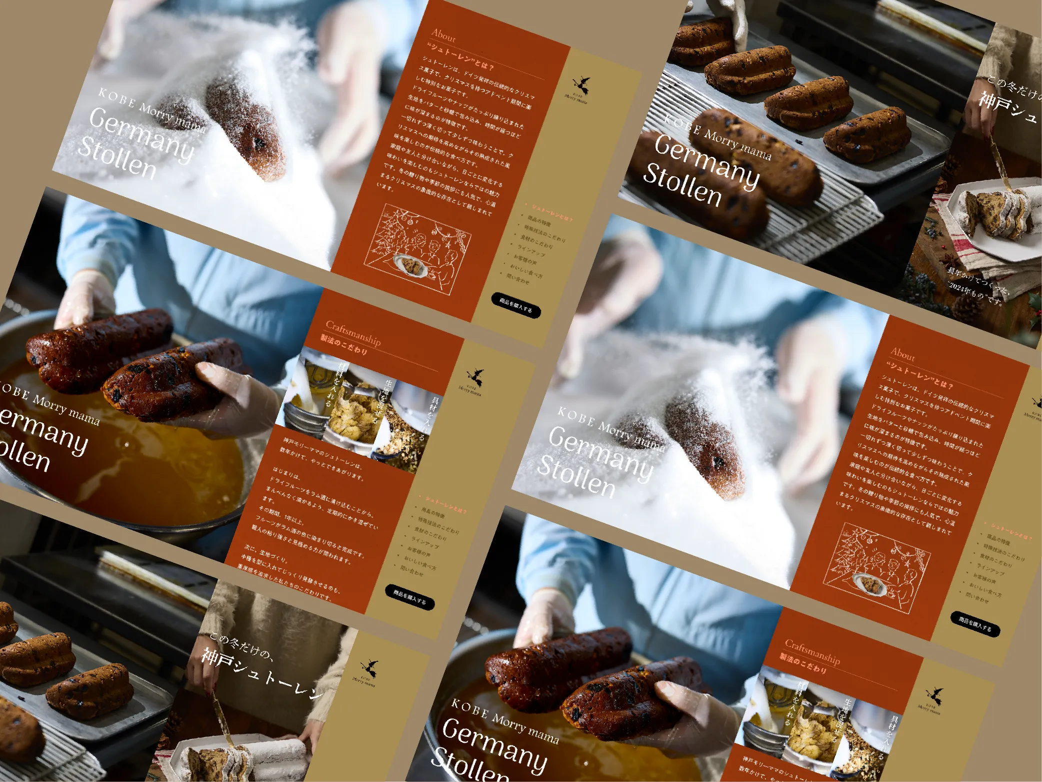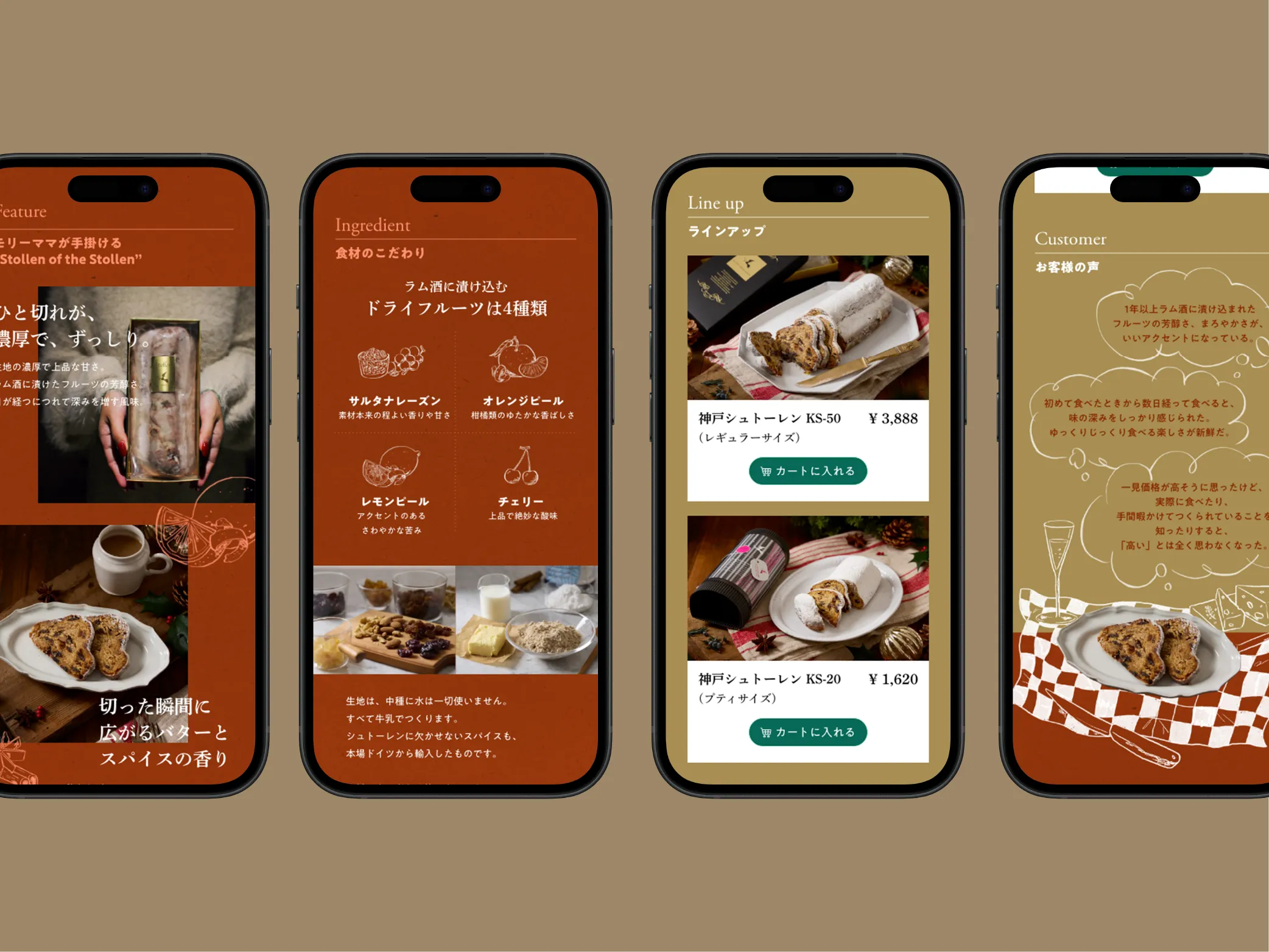 冬の定番スイーツ・シュトーレンの、季節限定LPサイトを制作しました。大切にしたのは、「本物のぬくもり」と「手仕事の確かさ」を、静かに丁寧に伝えること。レシピはドイツのシェフから受け継いだものですが、“ドイツ”という直接的な言葉を使わず、本場らしさがにじむような表現を意識しました。撮影は工場で1日かけて実施。素材の扱い方や手の動き、語られる想いなど、現場の空気をそのまま映し取り、画面越しにも伝わるように構成しました。サイト全体の世界観は、クリスマスの高揚感と、クラシックな落ち着きをあわせ持つトーンに。丁寧に作られたひとつの商品が持つ重みや特別感が、じんわりと伝わるようなストーリー設計を心がけています。