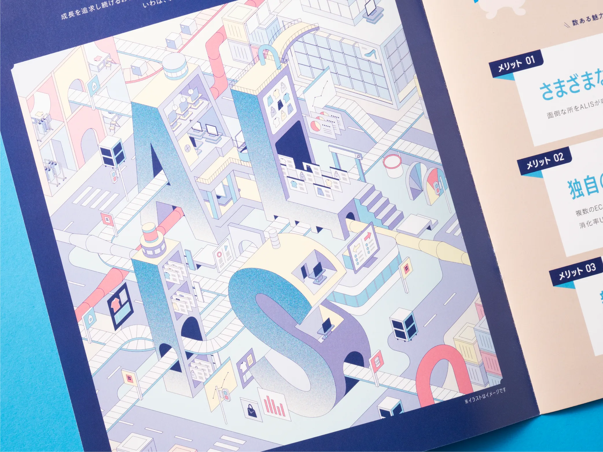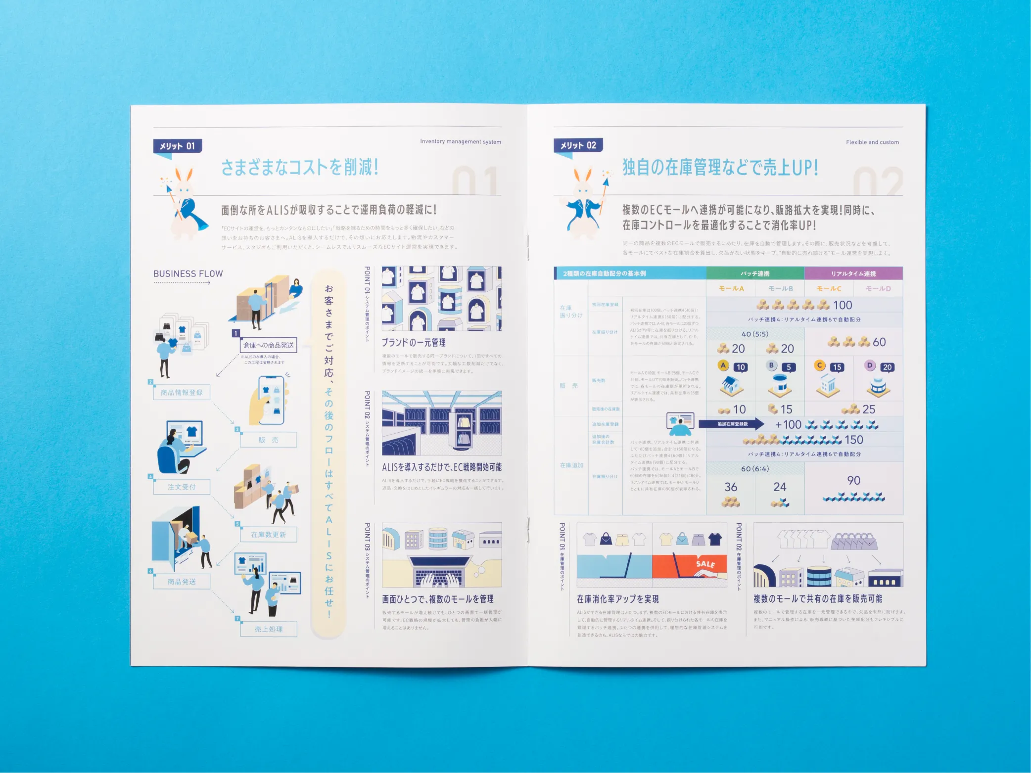 アパレル業界向けの在庫一元管理システム「ALIS(アリス)」のパンフレットを、企画段階から担当しました。多様なアパレルブランドとの取引を持つアッカ・インターナショナルが開発した本システムは、物流とECの在庫を横断的に管理できる点が特徴です。物流の流れを、ひと目で理解できるような「街」のようなビジュアルで表現し、「ALIS」の文字に仕組みを組み込む形で構成。一般的な“物流=トラック”といったイメージから一歩離れ、すっきりと洗練されたトーンを意識しながら、視覚的な分かりやすさとビジュアルの美しさを両立させています。完成後は、営業ツールとしても展開されるなど、用途の広がりにもつながる制作となりました。
